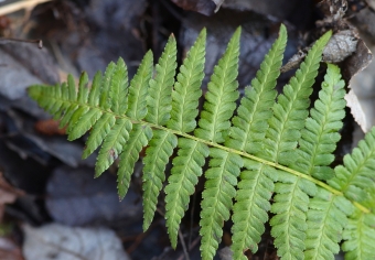 Le foglie fruttifere sono lunghe da 30 a 60 cm, sterili da 15 a 30 cm. La superficie fogliare è strettamente allungata, leggermente ristretta alla base. Il gambo fogliare è sottile, fragile, raramente seminato con squame, lungo almeno la metà della superficie fogliare. Segmenti seghettati, spesso con la parte inferiore rivolta verso l'alto. Veli renali coriacei. Cresce nelle paludi forestali e su suoli torbosi dalle pianure alla cintura del Montana.
