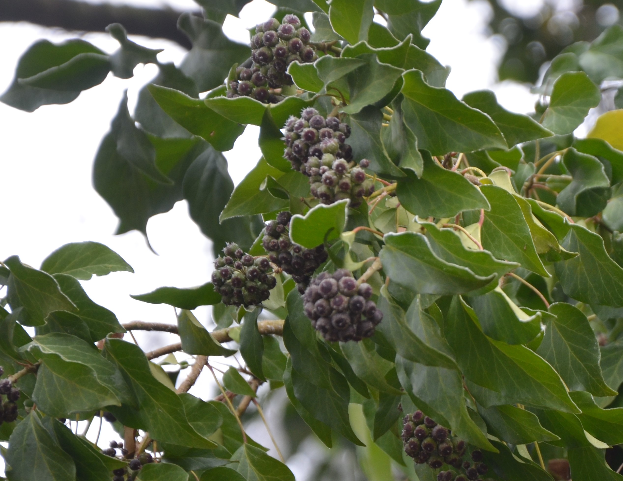 Vračajoč se proti vstopni točki mojega današnjega sprehoda v krošnji hrasta opazim še kobulasta soplodja navadnega bršljana (Hedera helix).